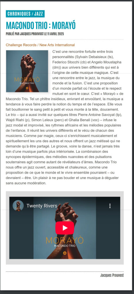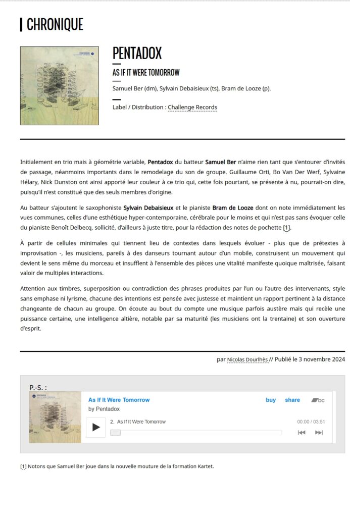 « Sylvain [Debaisieux], que ce soit avec Pentadox, Lynn Cassiers, Terpsichore, Martin Salemi ou, plus loin, le brillant projet « Heptatomic » d’Eve Beuvens, n’a jamais cessé de marquer de sa personnalité tous les groupes qu’il a croisés (Jean Pierre Goffin, Jazzmania) »